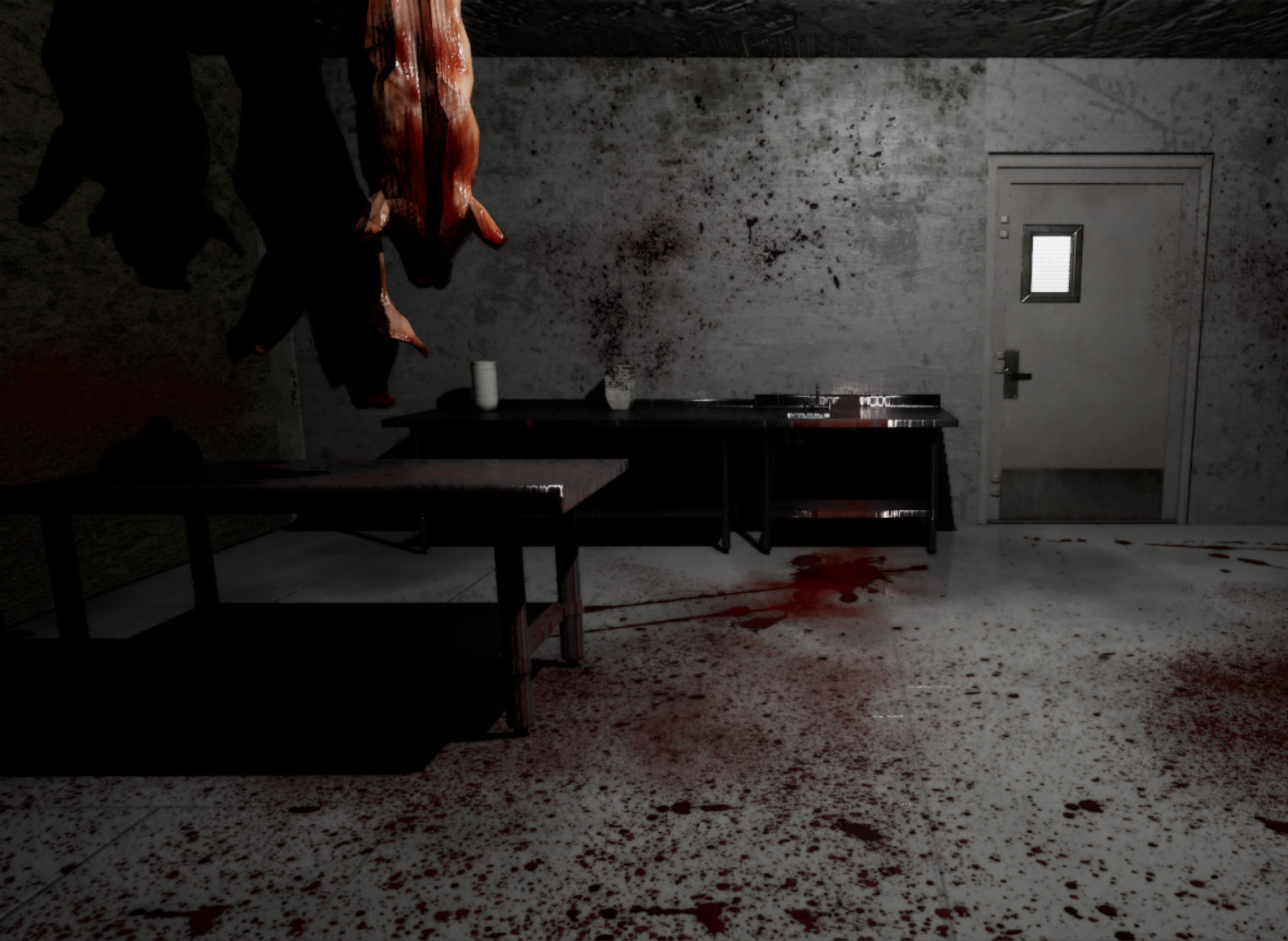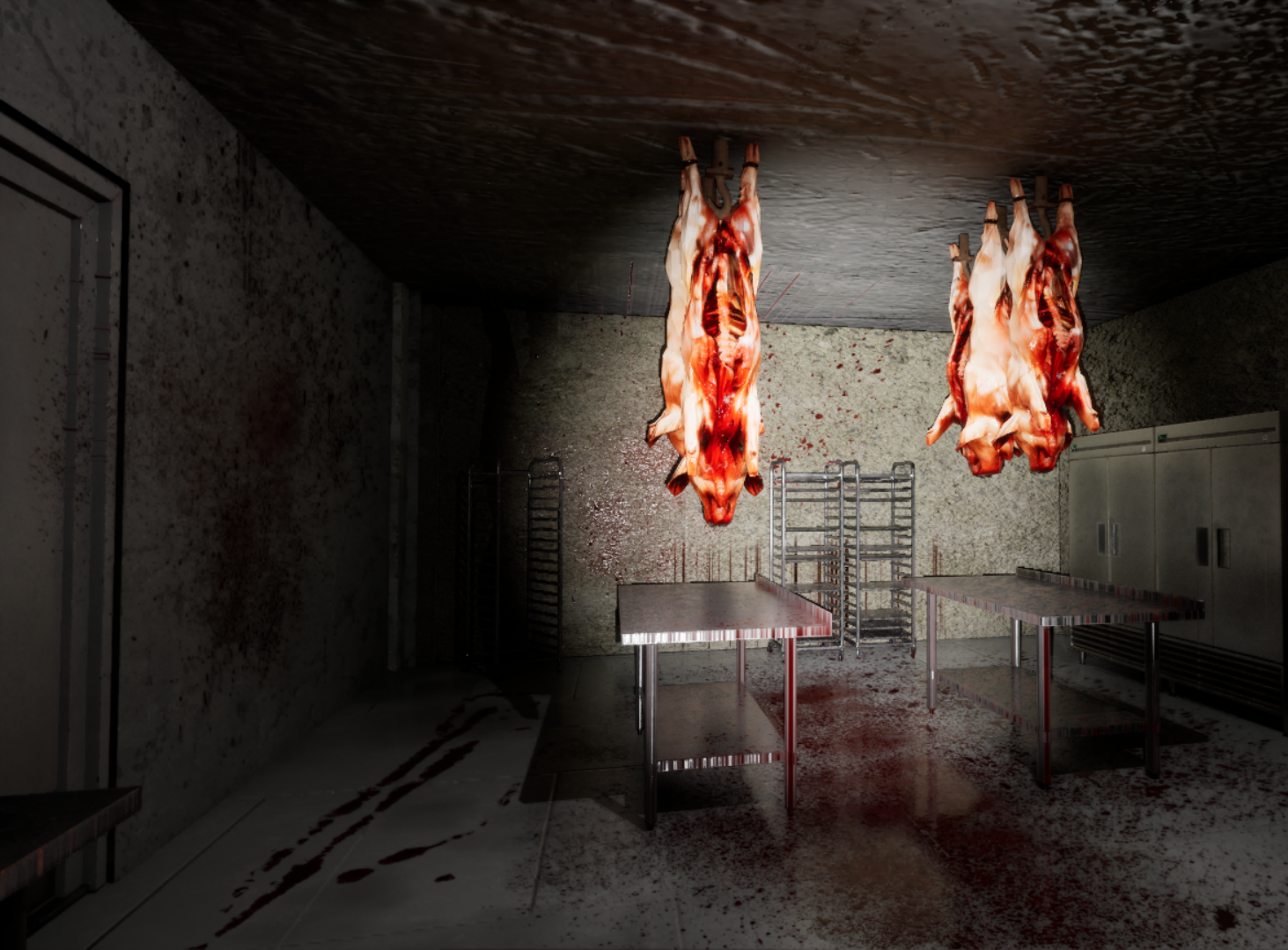 • A dark slaughterhouse setting with oppressive atmosphere